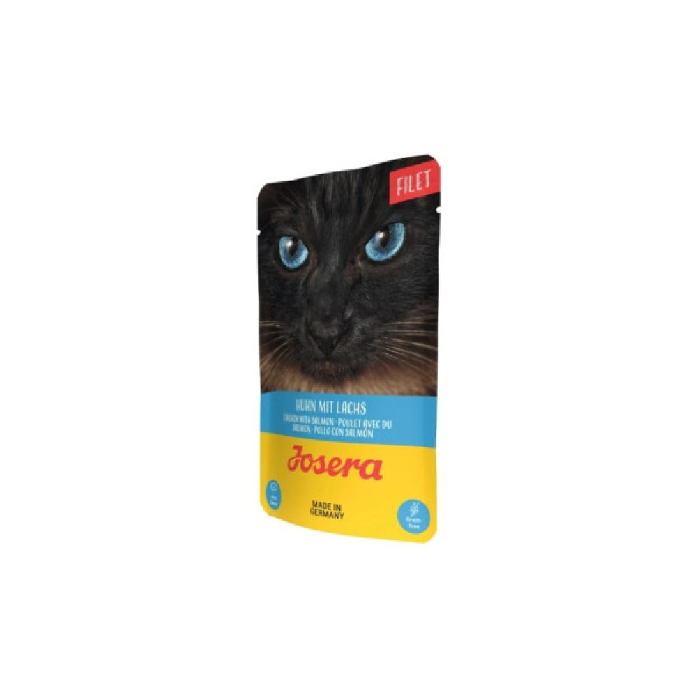 Вологий корм для кішок Josera Filet Huhn mit Lachs — це вишукане гастрономічне задоволення для вашого пухнастого гурмана. Упаковка вагою 70 г містить соковиті шматочки філе курки та лосося, що надають незрівнянного смаку та задовольнять навіть найвибагливішого маленького хижака. Завдяки високому вмісту м’яса та риби, корм забезпечує вашого улюбленця всіма необхідними вітамінами та мінералами.