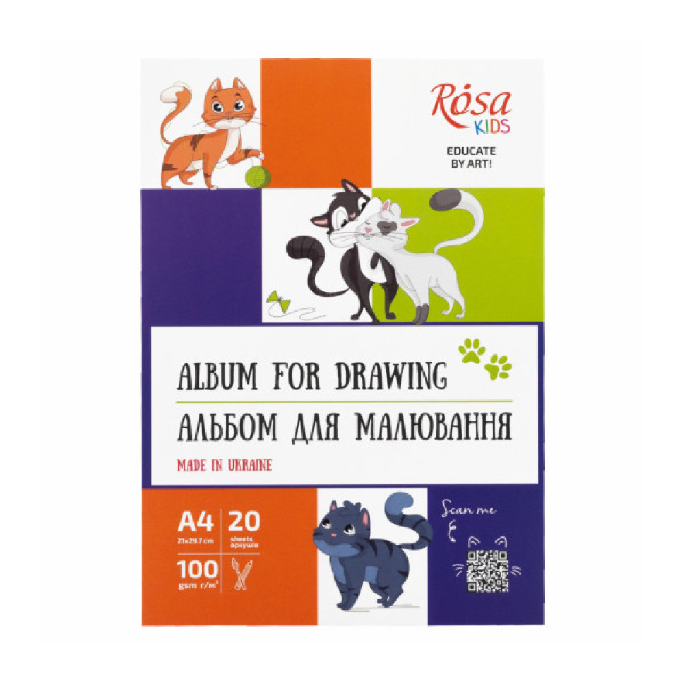 Альбоми доступні у 2-х видах кріплення листів: на спіралі та склейка. В альбомах на спіралі легко перегортаються листки та завдяки перфорації зручно від'єднувати аркуші, що особливо важливо для дітей 3-6 років. Коли маленький художник завершив свою роботу. то може з легкістю від'єднати аркуш, не хвилюючись, що він може пошкодитись. Спіраль складається з двох частин, які не доходять до країв альбому, в результаті менше заважає в роботі та не травмує ніжні пальчики. Альбом-склейка має якісну та еластичну проклейку аркушів. Листки надійно з'єднані між собою, не розпадаються при перегортанні, але при цьому легко від'єднуються від альбому при необхідності. Щільна обкладинка та підкладка з картону захищають папір та готові роботи від зминання, затирання у портфелі чи папці. Вони надовго зберігають кращий зовнішній вигляд при тривалому використанні, зберіганні чи транспортуванні. Основні властивості альбомів ROSA Kids: - якісний білий папір щільністю 100 г/м2; - 2 види кріплення листів в альбомах: спіраль та склейка; - листи з перфорацією в альбомах на спіралі; - підходить для різних технік: малювання олівцями, акварельними, гуашевими фарбами; - щільна обкладинка та підкладка з картону захищають папір та готові роботи від зминання; - стильний дизайн, що не повторюється в різних альбомах. Серія товарів для дитячої творчості від ROSA Kids - це перша сходинка до розкриття творчих талантів дитини, мотивація та зацікавлення. Обирайте гуаш, акварель, пластилін та альбоми в єдиному котячому стилі та насолоджуйтесь цікавими пригодами з улюбленими персонажами.Характеристики