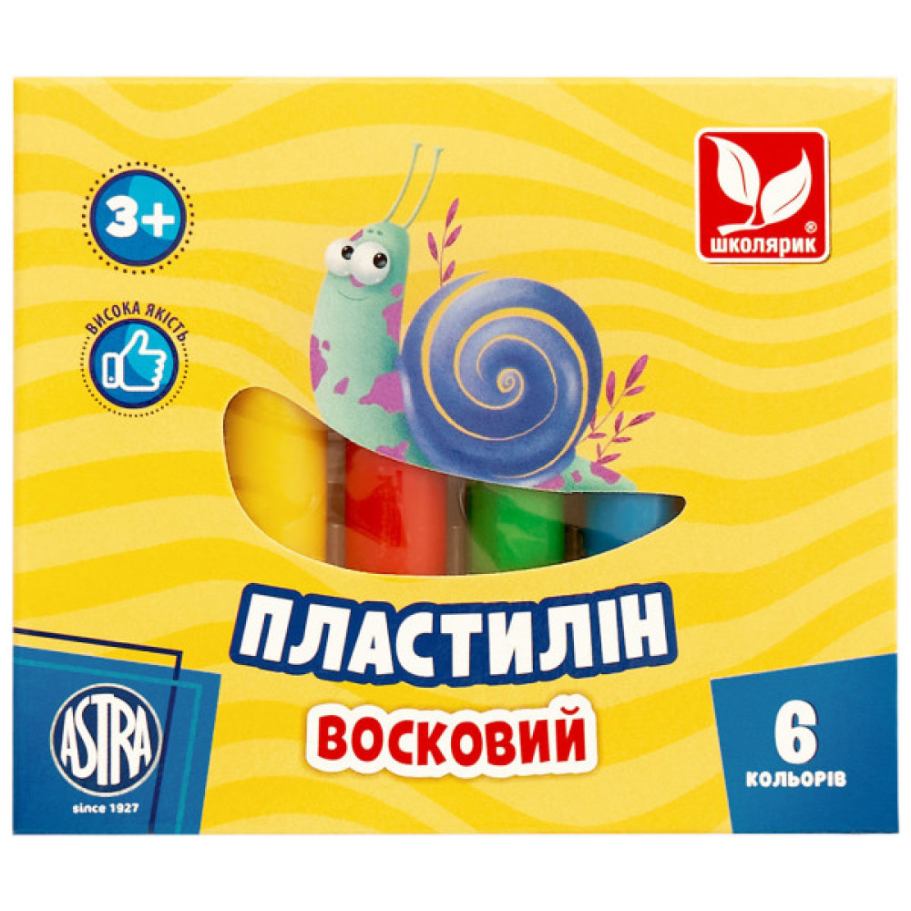 Пластилін 6 стіків по 13 г, довжина 8,2 см (кольори білий, жовтий, червоний, зелений, синій, чорний); склад: віск, вазелін, карбонат кальцію і магній, пігменти; пластиковий лоток — 1 шт. PET, упаковка 4+0 9,5*1,6*9,5 см - 1 шт.