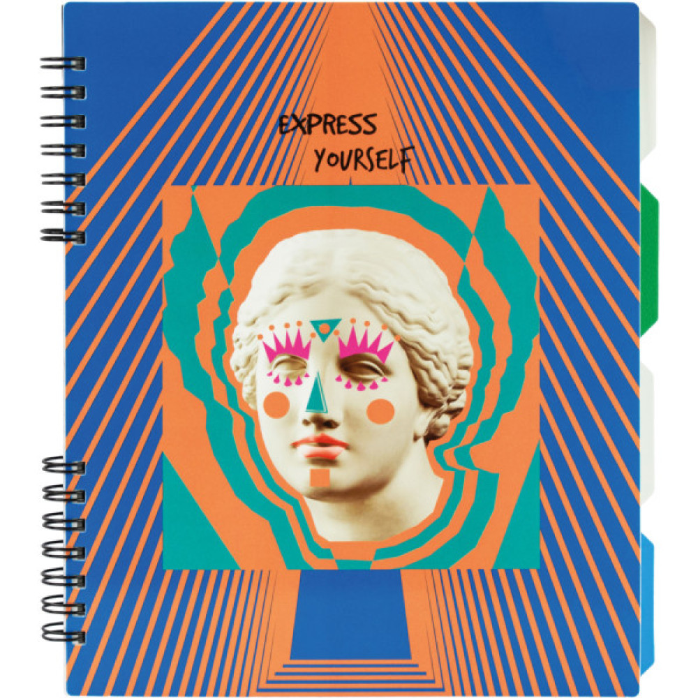 Блокнот формату B5 (170x205). Кріплення блока — спіраль. Обкладинка — пластик. Внутрішній блок — клітинка, цупкість паперу — 65 г/м², кількість аркушів — 120. З роздільниками блока. Вироблено в Україні.