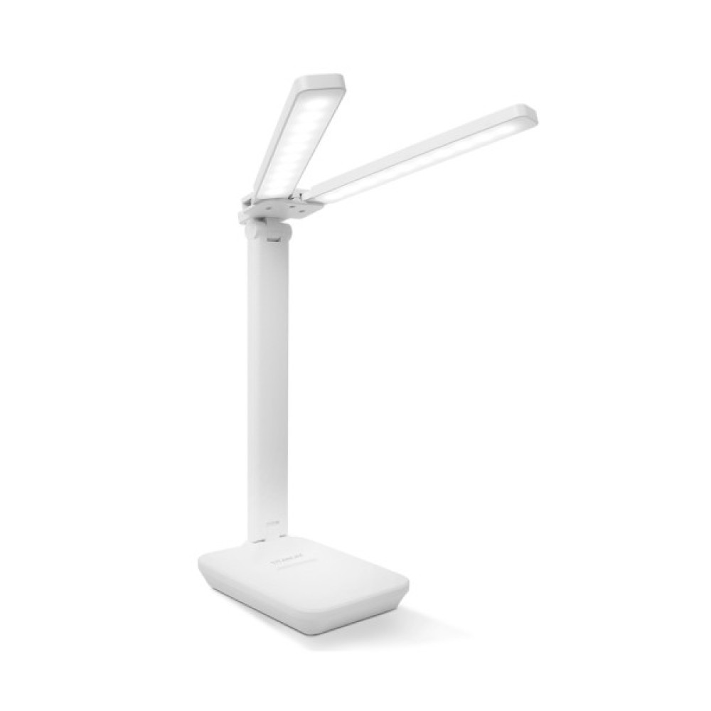 Світлодіодна настільна лампа з акумулятором TITANUM TLTF-010W - стильна та економічна з можливістю регулювання яскравості та колірності. Лампа абсолютно безшумна, компактна та має тривалий термін служби. Корпус виготовлений з екологічно безпечного високоякісного пластику білого кольору. Зовнішнє покриття корпусу імітує шкіру, що також додає лампі більший захист від подряпин. Пристосована для розміщення на робочому столі та призначена для його освітлення. Рухома конструкція лампи дозволяє скеровувати світло у потрібному напрямку. А особливістю лампи є те, що верхня частина корпусу лампи розділена на дві частини і це дозволяє ще більше підлаштовувати її під власні потреби. Реалізована можливість регулювання яскравості та зміни колірності світла, що сприяє зменшенню навантаження на органи зору в різних умовах та під час різних видів діяльності. Слугує також в якості підставки для смартфона, на корпусі для цього є спеціально відведене місце з бортиком.