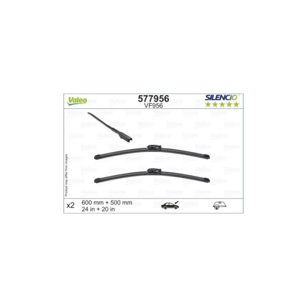 Двірники для авто від бренду Valeo моделі 577956 призначений спеціально для видалення різної вологи і забруднень з вітрового скла транспортного засобу. Наявність такого пристрою на лобовому склі автомобіля, є одним з важливих параметрів для безпеки водія. Складається даний пристрій з важеля, а також гумової щітки. Прибирає воду з поверхні скла завдяки щітці, яка рухається вгору і вниз. Є можливість регулювати швидкість руху щітки, існують кілька рівнів швидкості. Рекомендується проводити полірування скла, так як це впливає на сприятливу роботу двірників, робота відбувається набагато ефективніше, швидше, а також збільшується максимальний час експлуатації. Бажано хоча б раз на рік знімати двірники з транспортного засобу і промивати у воді. Виготовлений з високоякісних матеріалів, досить міцний. Кожен вид двірників має свої плюс і мінуси в різних ситуаціях. Дані склоочисники є безкаркасними. Мають невисоку вартість і просту конструкцію. Довжина даного пристрою становить 600/500 мм. Кількість в упаковці: 2 шт.