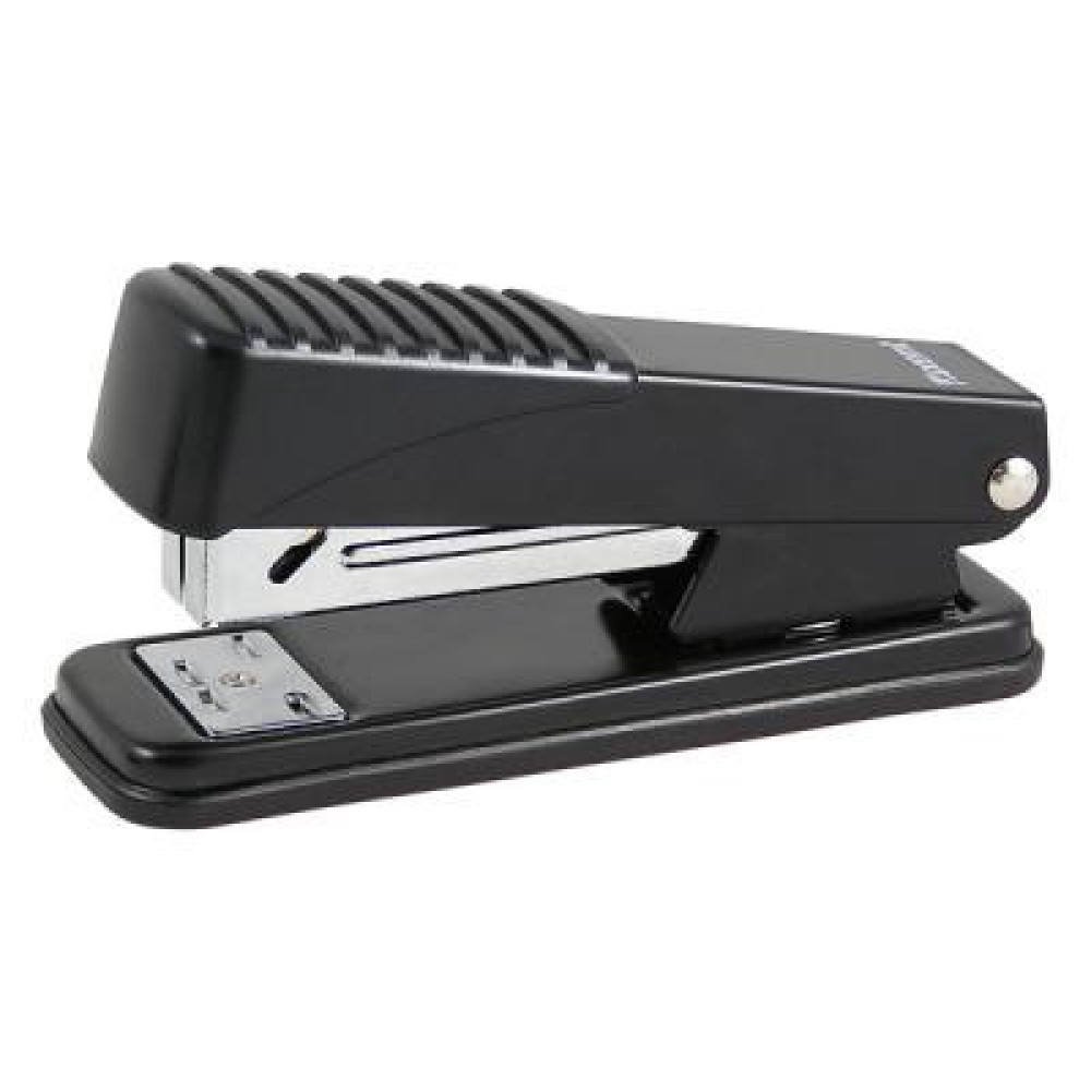 Всі робочі механізми і корпус виконані з металу. Пластикова вставка зверху на рукоятці забезпечує ергономічність використання. Можливість зміни способу скріплення з закритого на відкрите — натисканням кнопки на підошві степлера. Віконце контролю наявності скоби. Прогумована підошва.